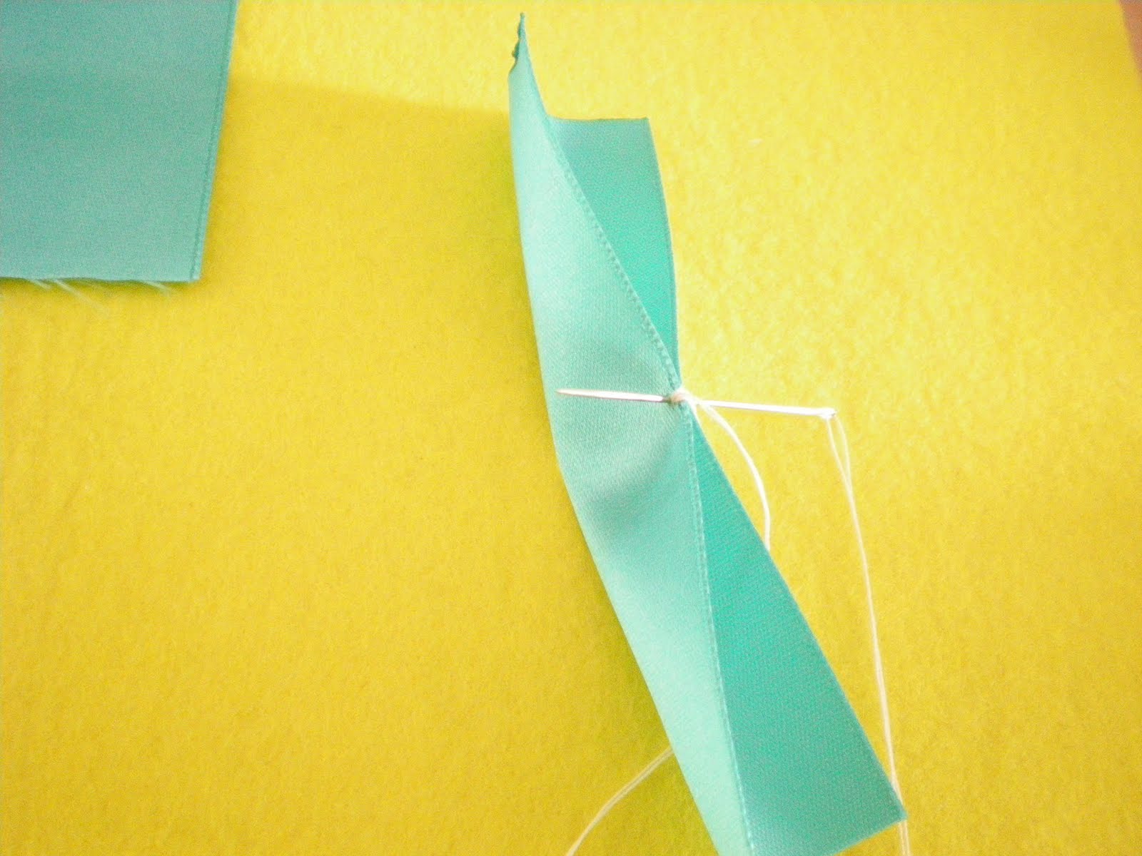 YA QUE LES DES UNA PUNTADA A CADA UNO, VAS DOBLANDO POR LA MITAD, LOS VAS HILVANANDO POR LA ORILLA SIN REMATAR, ASI HASTA QUE HAYAS HILVANADO LAS CINCO TIRAS, Y SE VA FORMANDO EL PETALO.
