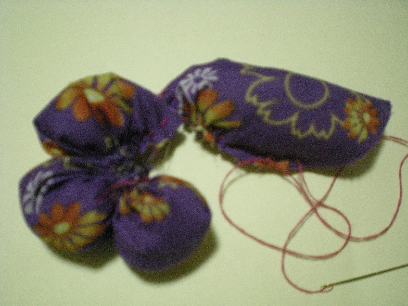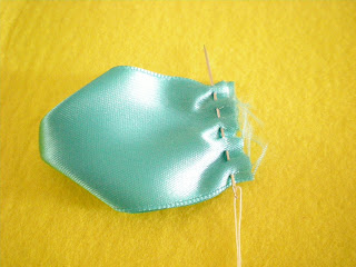 YA QUE LES DES UNA PUNTADA A CADA UNO, VAS DOBLANDO POR LA MITAD, LOS VAS HILVANANDO POR LA ORILLA SIN REMATAR, ASI HASTA QUE HAYAS HILVANADO LAS CINCO TIRAS, Y SE VA FORMANDO EL PETALO.