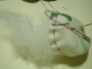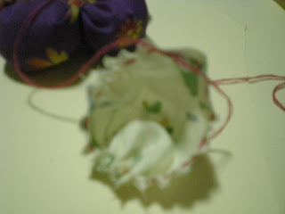 YA CORTADOS LOS LISTONES, SE LES DA UNA PUNTADA POR LA MITAD A CADA UNO DE ELLOS Y POR SEPARADO.