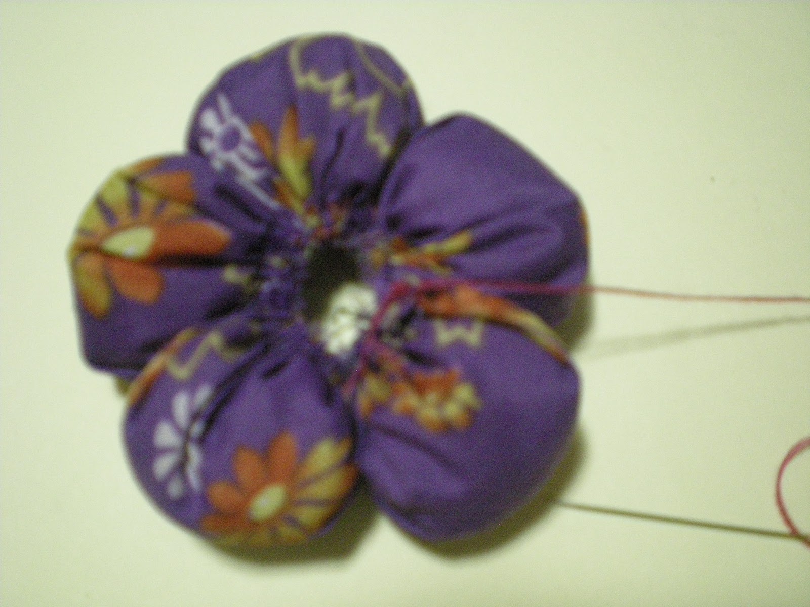 CUANDO HAYAS TERMINADO DE HILVANA LOS 5 PETALOS, LO VAS A COMENZAR A JALAR HASTA QUE QUEDEN FRUNCIDOS LOS PETALOS, ASI DEBE DE QUEDARTE.
