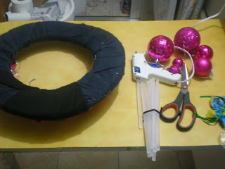 Se forra el redondel de icopor con tela para comenzar a pegar las esferas.
